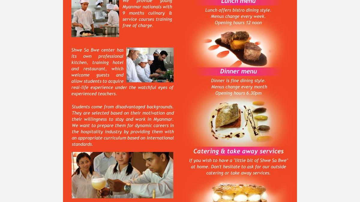 Founded by Francois Stoupan in early 2013, Shwe Sa Bwe is a hotel and restaurant training center which aims to provide training to financially disadvantaged Myanmar youth looking to pursue a career in the country’s hospitality industry. As a matter or fact, they are looking for Consultant Chefs, please see below: